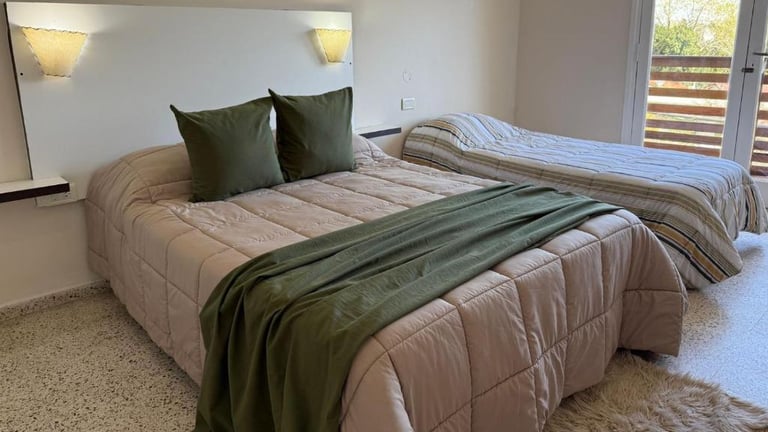 Tenemos habitaciones disponibles para 2, 3 y 4 personas, cada una equipada con cómodas camas sommier, televisión por cable y baño privado. Nuestras habitaciones ofrecen un ambiente acogedor y relajante para que puedas disfrutar de una estancia placentera y tranquila. Tanto si viajas en pareja, en familia o con amigos, tenemos el espacio perfecto para satisfacer tus necesidades. El sommier garantiza un descanso óptimo, mientras que la televisión por cable te brinda entretenimiento variado. Además, contar con un baño privado te permite disfrutar de mayor privacidad y comodidad. Nuestras habitaciones están diseñadas pensando en tu confort, para que te sientas como en casa durante tu estadía. ¡Esperamos poder recibirte pronto!